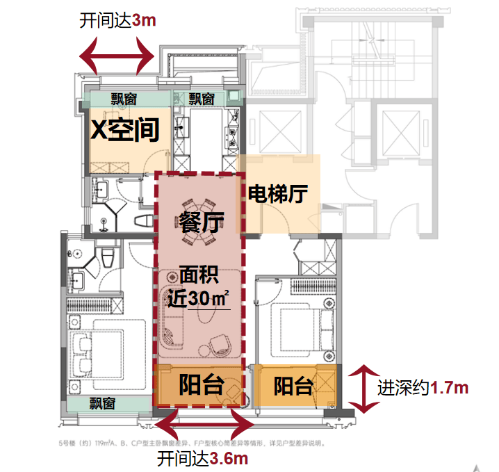 厨房飘窗拓展为实用收纳区,告别传统“飘窗+薄柜”的配置,实现功能与尺度的双重升级。 客厅开间达3.6米,连接约1.7米进深阳台,客餐厅总面积约30㎡,视野开阔,活动自如。