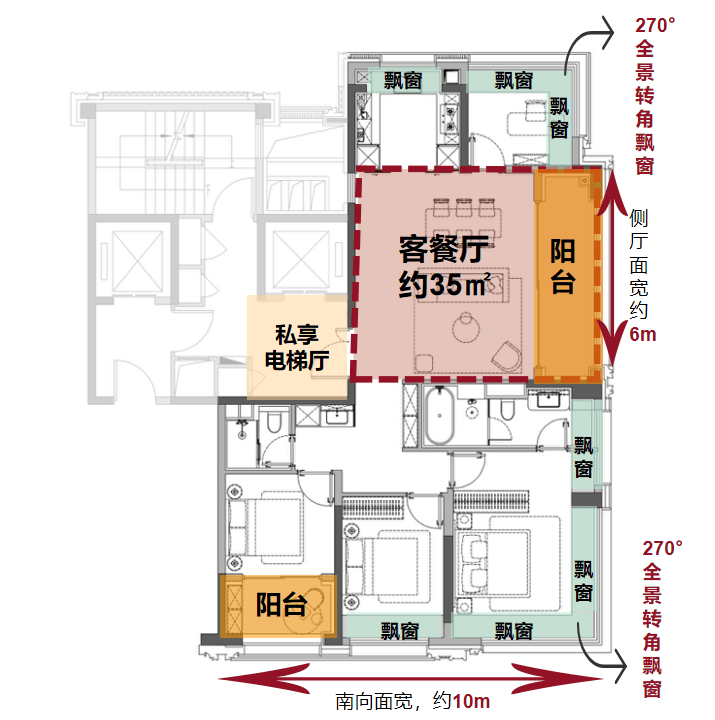 这个户型南向面宽约10米,设计上不走寻常路,打造环岛式侧厅,侧厅面宽近6米,联动同面宽多变阳台,形成约35㎡的开放式社交核心场域!