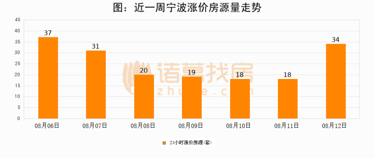 根据诸葛找房数据显示,宁波24小时涨价房源量为34套,较08月11日增加16套,环比上涨88.9%。与此同时,涨价房源占比小幅扩大,业主信心有所提升。