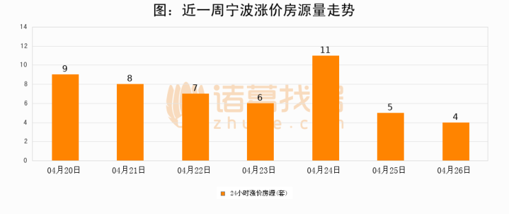 根据诸葛找房数据显示,宁波24小时涨价房源量为4套,较04月25日减少1套,环比下降20%。与此同时,涨价房源占比小幅回落,对于购房者来说是一个入市窗口期,购房者可抓住时机入市。