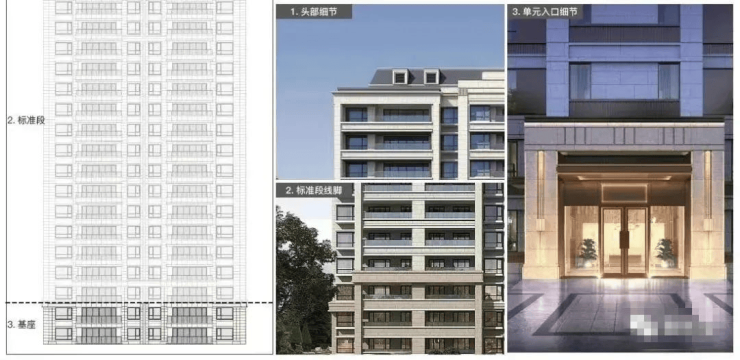 细节:外立面采用石材基座+仿石铝板+局部仿石涂料组合,干挂工艺呈现挺拔线条,采用超低能耗建筑技术体系,带来更经济、更静谧、更舒适、更健康的人居体验