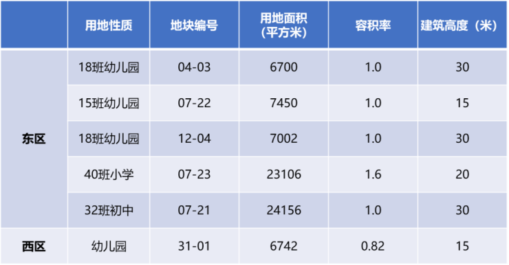 东区和西区最大的不同在于教育和公建设施配套,东区人口更密集,有5幅教育用地,从幼儿园至初中;而西区仅有1幅教育用地,作为幼儿园。