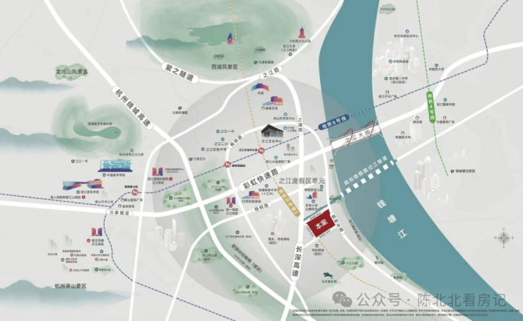 生态环境:北靠西湖景区,东望钱塘江,直线距离钱塘江仅800米,坐拥五云山生态资源,周边3km范围内有15个公园
