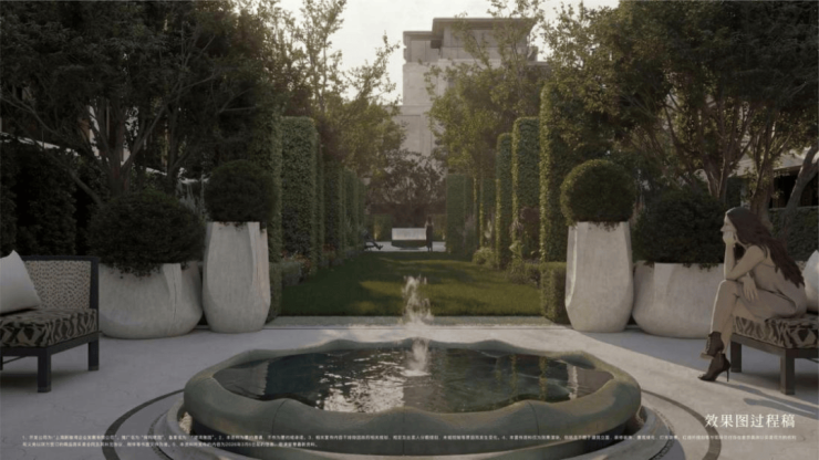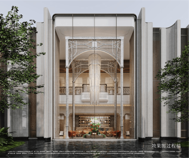 在建筑表达上,深度萃取巴黎白马庄园(Cheval Blanc Paris)核心美学,同时融合上海花园饭店、和平饭店、张园石库门等东方海派建筑元素,以“仪式感、纯粹性、细节感”为核心,打造兼具国际风范与海派底蕴的建筑格调仪式感上,对称式布局搭配精致雕花纹饰,入户动线仪式感拉满;