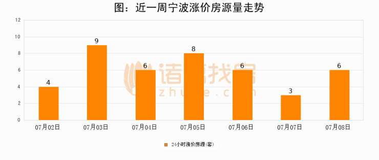 根据诸葛找房数据显示,宁波24小时涨价房源量为6套,较07月07日增加3套,环比上涨100%。与此同时,涨价房源占比小幅扩大,业主信心有所提升。