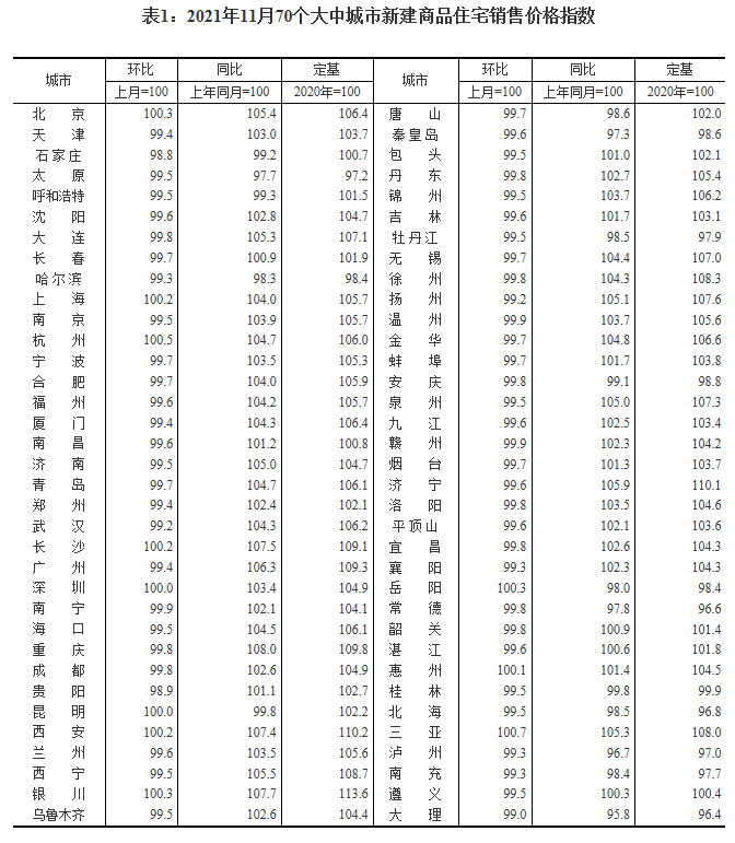 国家统计局城市司首席统计师绳国庆解读称,11月份,70个大中城市商品住宅销售价格环比延续下降态势,同比涨幅持续回落。