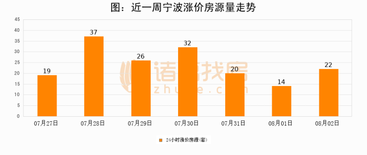 根据诸葛找房数据显示,宁波24小时涨价房源量为22套,较08月01日增加8套,环比上涨57.1%。与此同时,涨价房源占比小幅扩大,业主信心有所提升。