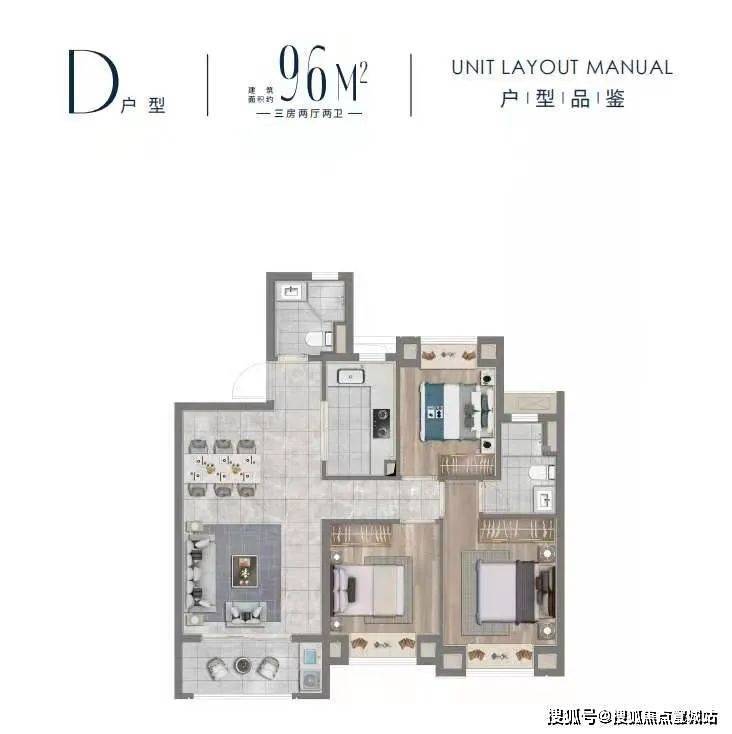 D户型建面约96㎡三房两厅两卫▼