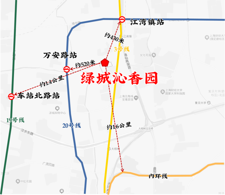 地铁:步行约500米可达3号线/20号线(在建)江湾镇站,双轨交环绕,7站直达人民广场,通勤便利