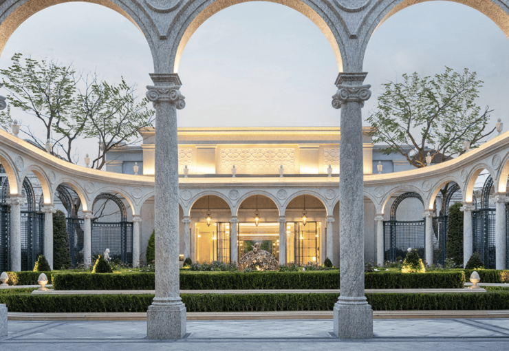 像苏州地王绿城玫瑰园,引入如凡尔赛宫的孟莎式屋顶的环岛式落客区,采用古罗马柱廊设计,整体空间超100米,法式宫廷气场非常恢弘;入口空间源自凡尔赛宫镜厅的宝格绿奢石,就像绿色“珠宝盒”,归家的高贵奢华感被拉满。