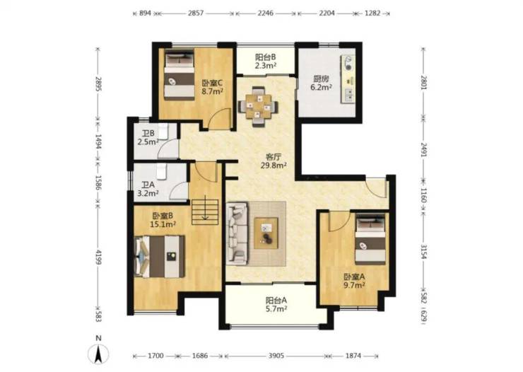 户型设计为一梯两户,南北通透,适合两代或三代同住