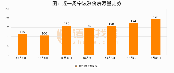 根据诸葛找房数据显示,宁波24小时涨价房源量为195套,较10月05日增加21套,环比上涨12.1%。与此同时,涨价房源占比小幅扩大,业主信心有所提升。