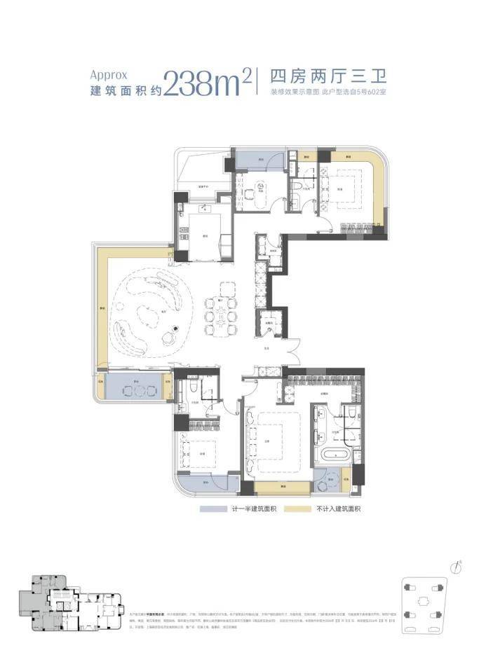 建面约238㎡四房三卫全景舱户型,全屋约46 米全景采光周长,客厅打造连续约 17 米三面采光界面,成就 IMAX 级环幕视野,搭配3.45米奢阔层高,让自然光无死角渗透;朝南双主卧套房搭配全屋六大系统化收纳空间,兼顾家族居住的私密性。