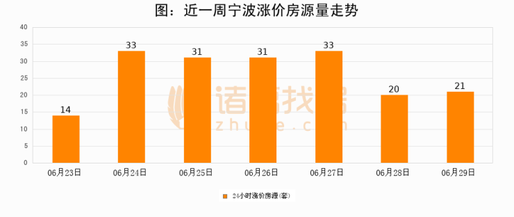 根据诸葛找房数据显示,宁波24小时涨价房源量为21套,较06月28日增加1套,环比上涨5%。与此同时,涨价房源占比小幅扩大,业主信心有所提升。