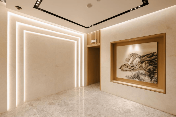 天安1号不是单独打造建筑本身,更是将生活场景与整体环境相融合,细节里都是满满的诚意:社区入口大堂将艺术感融入纯石材营造的界面;已经呈现的玻璃+木色装饰的休憩会客空间,让归家宛若进入艺术领地;